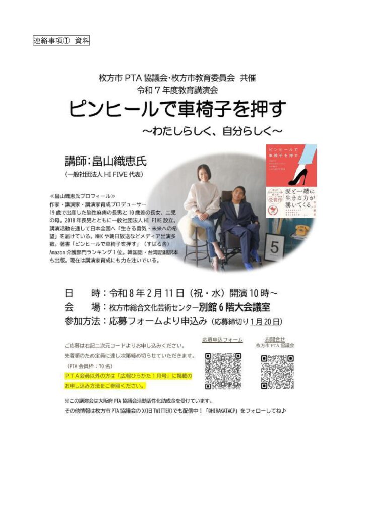 枚方市PTA協議会&枚方市教育委員会 令和7年度教育講演会ご案内